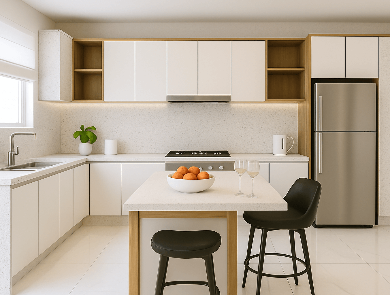 - Granite stone Counter Tops embedded with Seamless Pantry Cupboards.