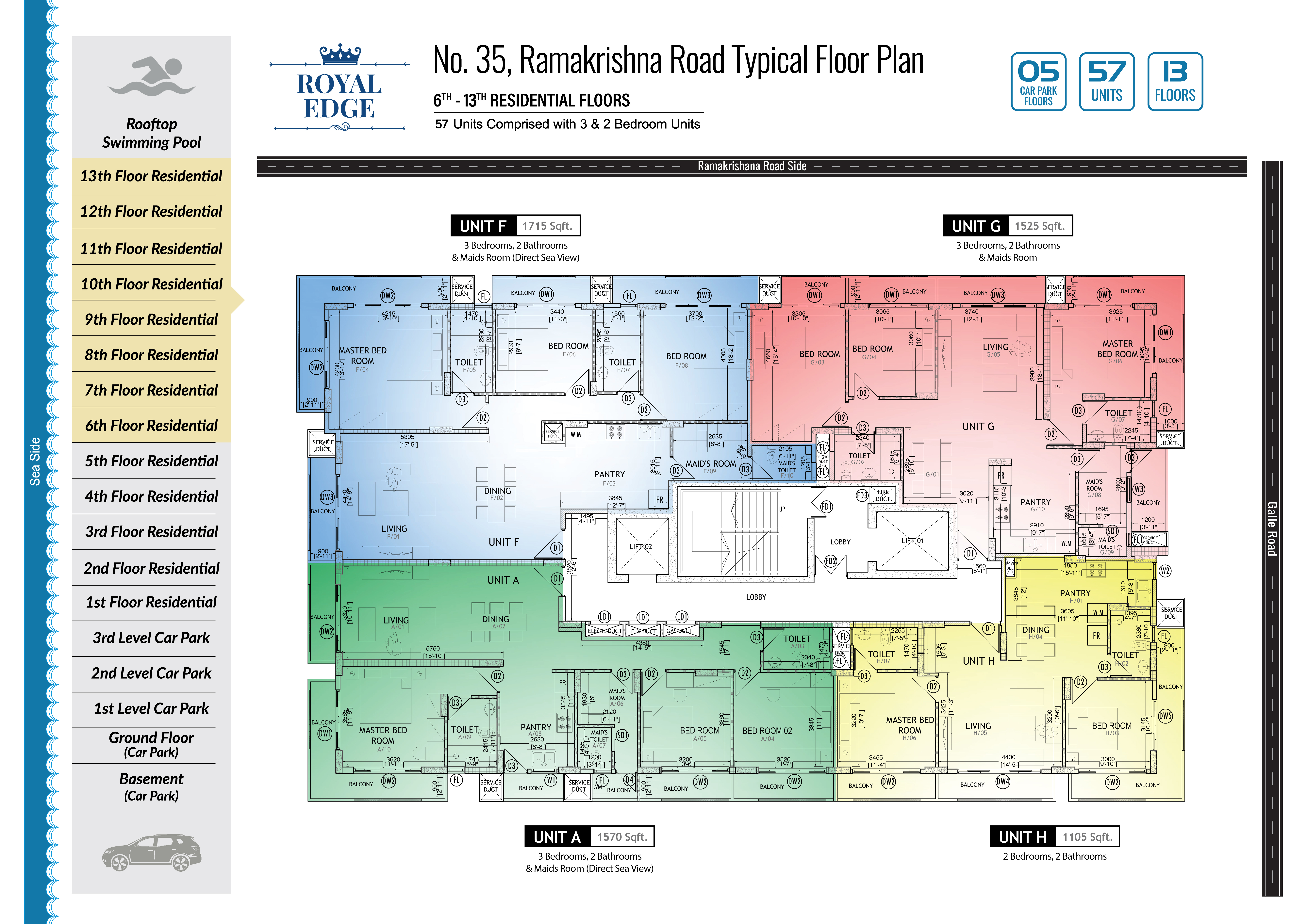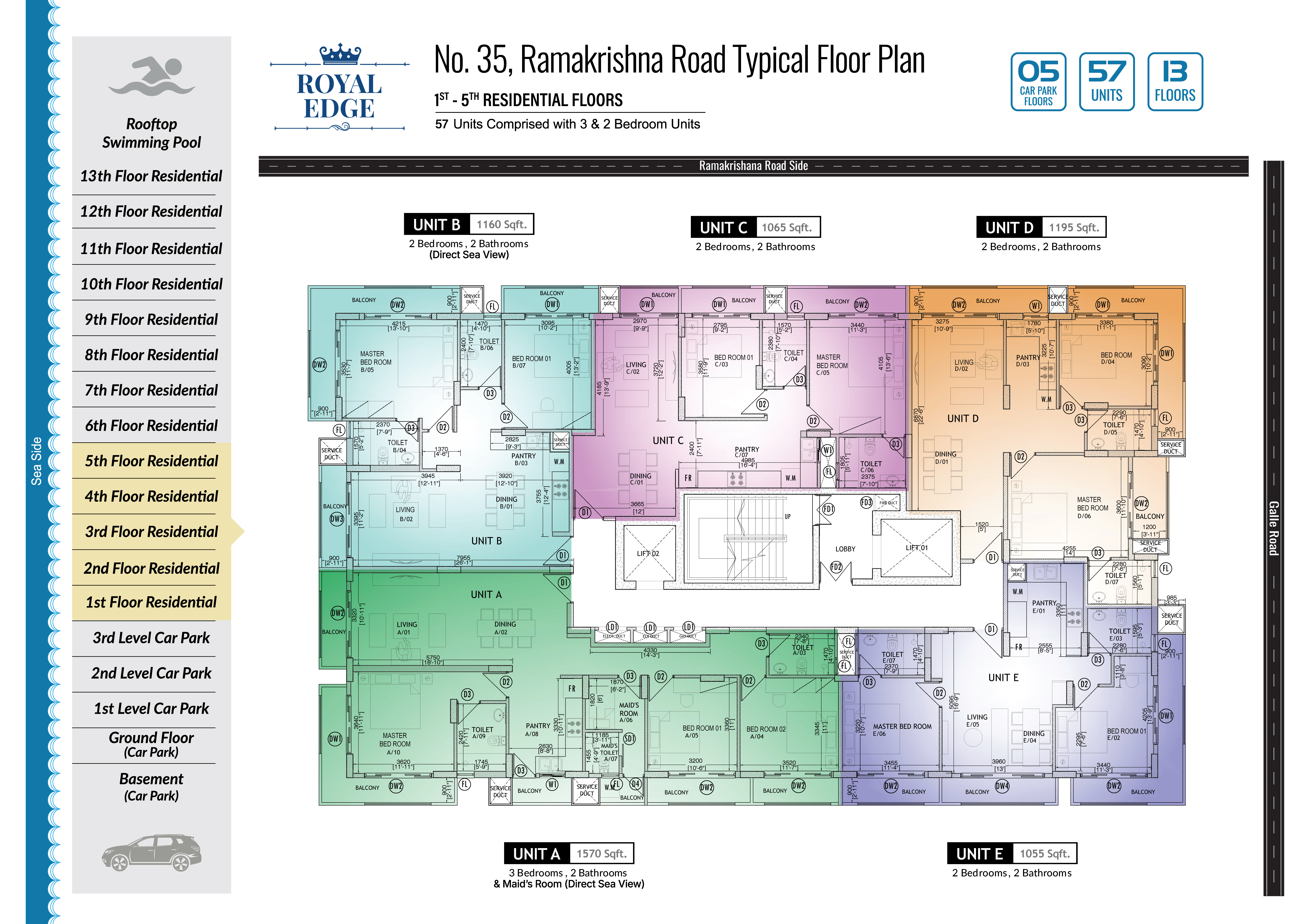 The Business Class Luxury Condominium project at No. 35, Ramakrishna Road, Wellawatte boasts 13 residential floors, housing 57 units, and featuring a 5-level car park.