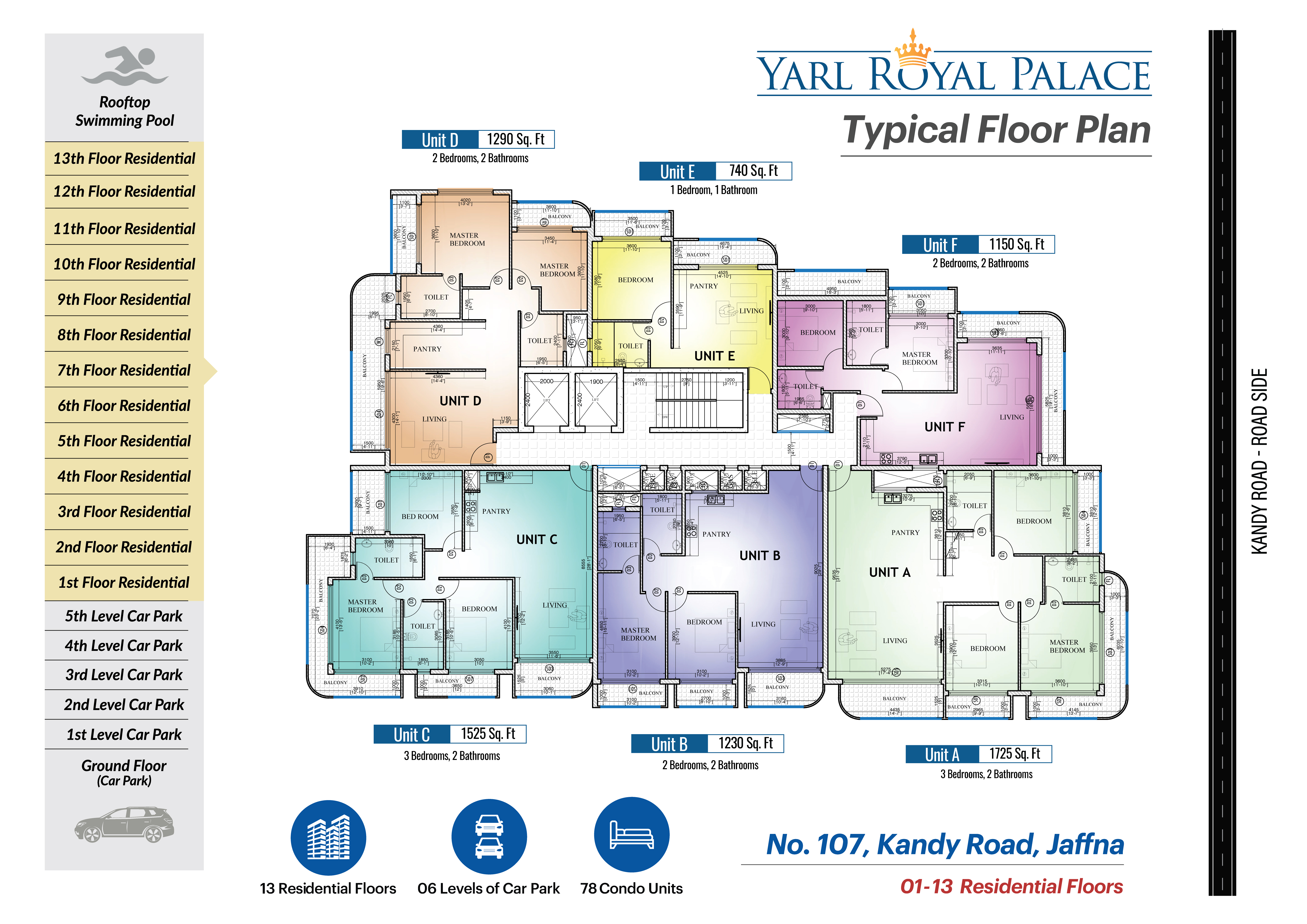The apartment complex spans 43.5 perches of land and features 6 levels of car parking , 13 residential floors , and 78 Apartment units . It offers a range of options, including studio , 2-bedroom , and 3-bedroom units.